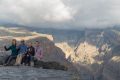 Al Hamra, Oman Heute geht unser Aufenthalt in Nizwa zu Ende. Unglaublich aber wahr, es hat in der Nacht stark geregnet. Das Wasser fließt im Wadi und überflutet die Straße gleich neben dem Hotel. Wir checken um 09:30h aus und fahren wieder Richtung Westen in das Dorf Al Hamra wo es noch sehr ursprüngliche Lehmhäuser und ein Museum gibt, das uns die Lebensweise der Omanis in früheren Zeiten zeigt. Unsere Erwartungen werden weit übertroffen – wir gehen durch eine ganze Ortschaft von Lehmhäusern, teilweise bereits eingestürzt, teilweise noch in sehr gutem Zustand. Man fühlt sich hier wie in die damalige Zeit zurückversetzt. Wir finden auch das Museum und sehen dort wie der omanische Kaffee geröstet wird, wie man damals Mehl gemahlen hat und daraus hauchdünnes Brot gebacken wurde und wie Öl aus Früchten aus den Bergen gepresst wurde. Zum Abschluss werden wir im Herrenzimmer noch auf Gingertee oder Kaffee mit Datteln eingeladen, natürlich am Boden sitzend. Beim Rückweg zum Auto kommen wir an direkt angrenzende Gemüsegärten im Palmenhain vorbei. Alles in Allem sehr überraschend, wie komfortabel die Lebensweise in solchen Lehmhäusern gewesen sein muß. Sicher ein weiteres Highlight unserer Rundreise. Jetzt gibt es zunächst einmal frisch gepresste Fruchtsäfte ( Wassermelone, Mango und Pineapple) und dann geht’s weiter. Unsere nächste Station ist Jabal Shams, der höchste Berg von Oman. Die Straße windet sich in steilen Serpentinen von ca. 600m Seehöhe auf ca. 2000m. Zunächst noch als Asphaltpiste, aber sehr bald nur mehr als Schotterpiste. Kurz bevor wir unser Quartier erreichen gibt es noch ein Aussichtspunkt, bei den man in einen tiefen Canyon, den s.g. Grand Canyon von Oman hinuntersieht. Die Felswände stürzen sich senkrecht in den Abgrund – es ist wieder einmal ein beeindruckender Punkt. Leider spielt das Wetter nicht ganz mit – es ist bewölkt und die Berghänge für unsere Fotos nicht optimal ausgeleuchtet. Trotzdem einfach toll!