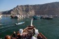 Khasab, Oman Heute stand eine Dhow Tour auf dem Programm. Nach dem Frühstück werden wir um 09:45h abgeholt und mit einem Bus in 5 Minuten zum Dhow-Hafen gebracht. Wir sind etwas überrascht, wie viele Autos bereits am Parkplatz stehen und wie viele Boote hier warten.
