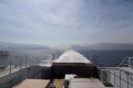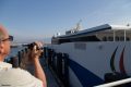Die Fähre ist ein 65m langer Katamaran, der mit ca. 75km/h über dem Wasser gleitet. Wir finden in der Passagierkabine einen gemütlichen 4er Platz. Um 11:30 laufen wir aus. Ähnlich wie im Flugzeug werden wir mit Essen und Trinken versorgt.