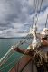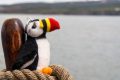 Komischerweise mussten wir uns alle was d’rüberziehen – schön musst net sein … Wir hatten ausnahmsweise gutes = sonniges Wetter. Da kein Wind ging blieben die Segel eingerollt und wir glitten trotzdem lautlos in die Bucht. Zu Beginn ging’s zur Lundey Insel die nur von Papageientauchern (Puffins) von Ende April bis Ende August bewohnt ist. Wir sahen viele dieser lustigen Vögel konnten sie leider aufgrund der Distanz und des Seegangs nicht gut ins Bild bringen. Ach ja und einer ist dann doch mit uns mitgekommen…