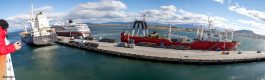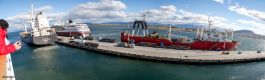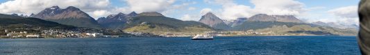 Tatsächlich überstehen wir den 20 Stunden Flug (11:45 Std. von Wien nach Rio de Janeiro, dort Auftanken des Flugzeuges und danach 5:30 Std. von Rio nach Ushuaia) recht gut und kommen fast ausgeschlafen dort an. Ushuaia hat ja nur einen recht kleinen Flughafen, deshalb dauert es auch recht lange bis die Einreiseformalitäten für die 400 Gäste erledigt sind. Danach ist von Plantours bereits alles perfekt organisiert. An jeder Ecke steht ein Mitarbeiter, der uns den Weg zu den Bussen zeigt, die uns zur MS Hamburg bringen werden. Fühlt sich für uns etwas komisch an 😕 so bemuttert zu werden. Das Wetter ist entgegen der Prognosen nur leicht bewölkt bis sonnig – alles scheint perfekt.