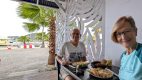 Unglaublich aber war, es regnet😮. Außerdem haben wir auch noch ein Problem mit der Zeit Umstellung und sind um 4:30 Uhr putzmunter. Ingrid hat ein Cafe entdeckt mit frischen Croissants, Omeletts und so weiter. Dort nehmen wir unser Frühstück ein und diskutieren, ob wir zur Erkundung der Insel einen Roller oder ein Auto nehmen . Angesicht des Regens entscheiden wir uns nach einiger Zeit für ein Auto. Im Zuge dieser verputzen wir unsere guten Omeletts, und merken erst am Schluss wie groß die Portionen waren – uff !