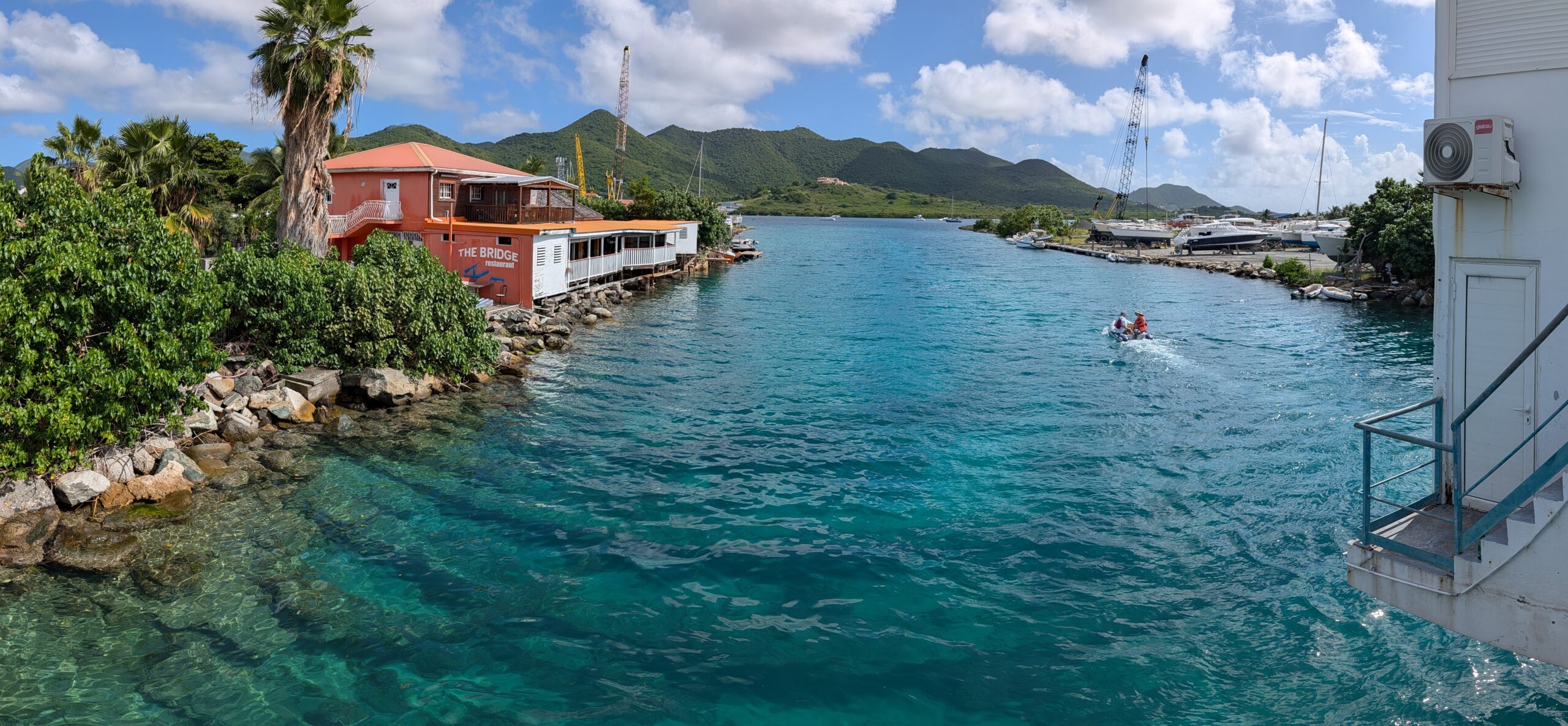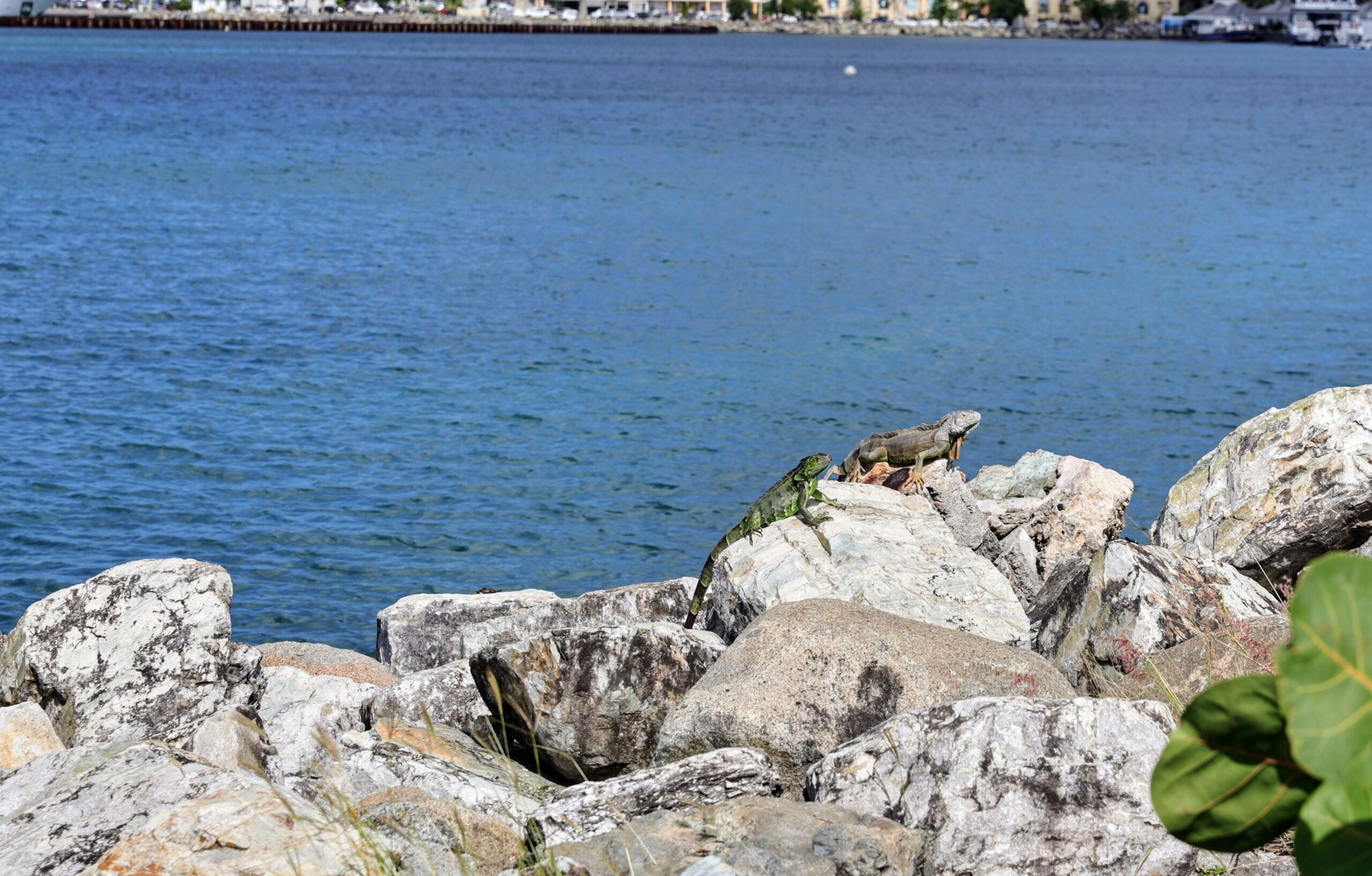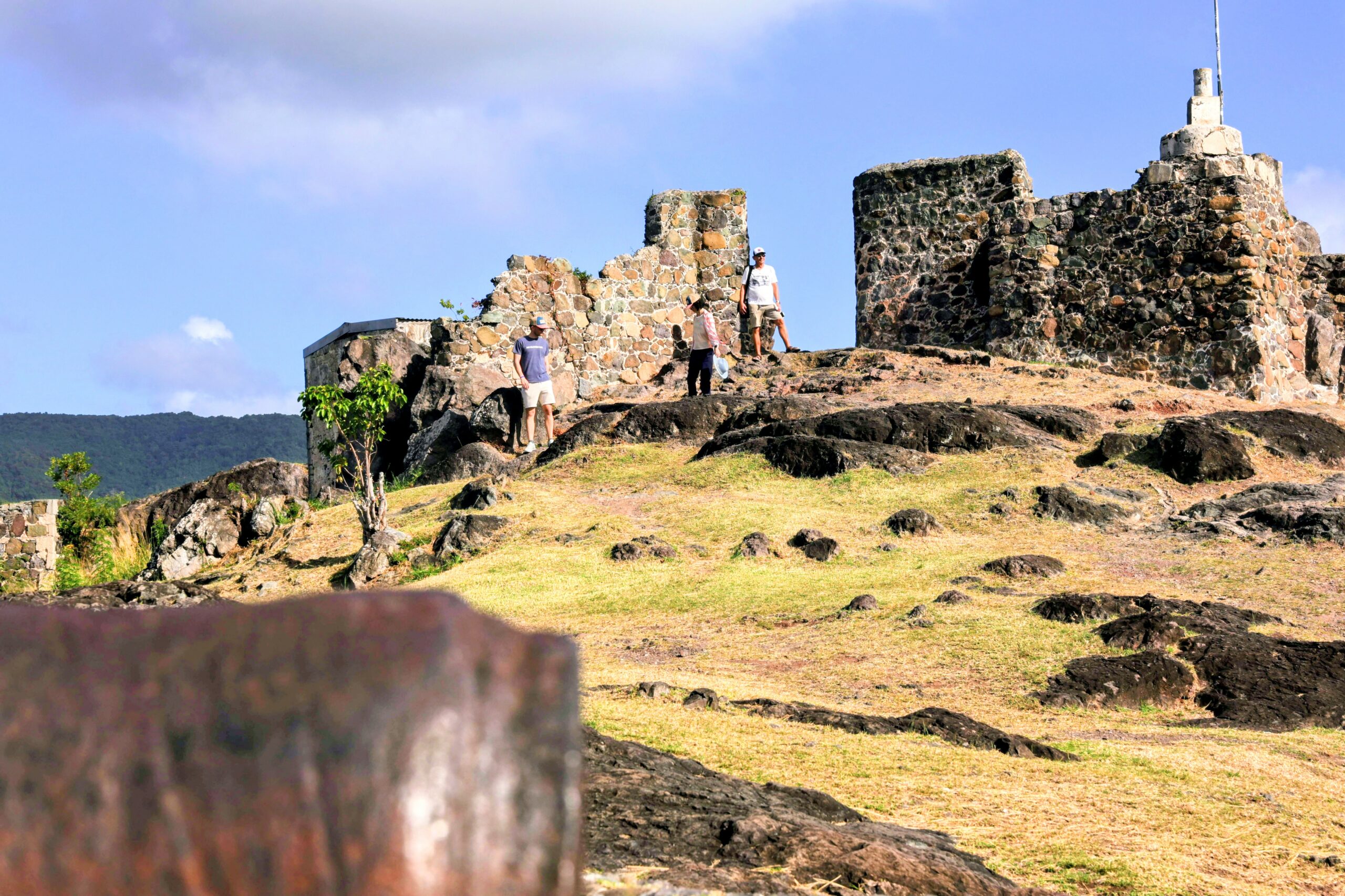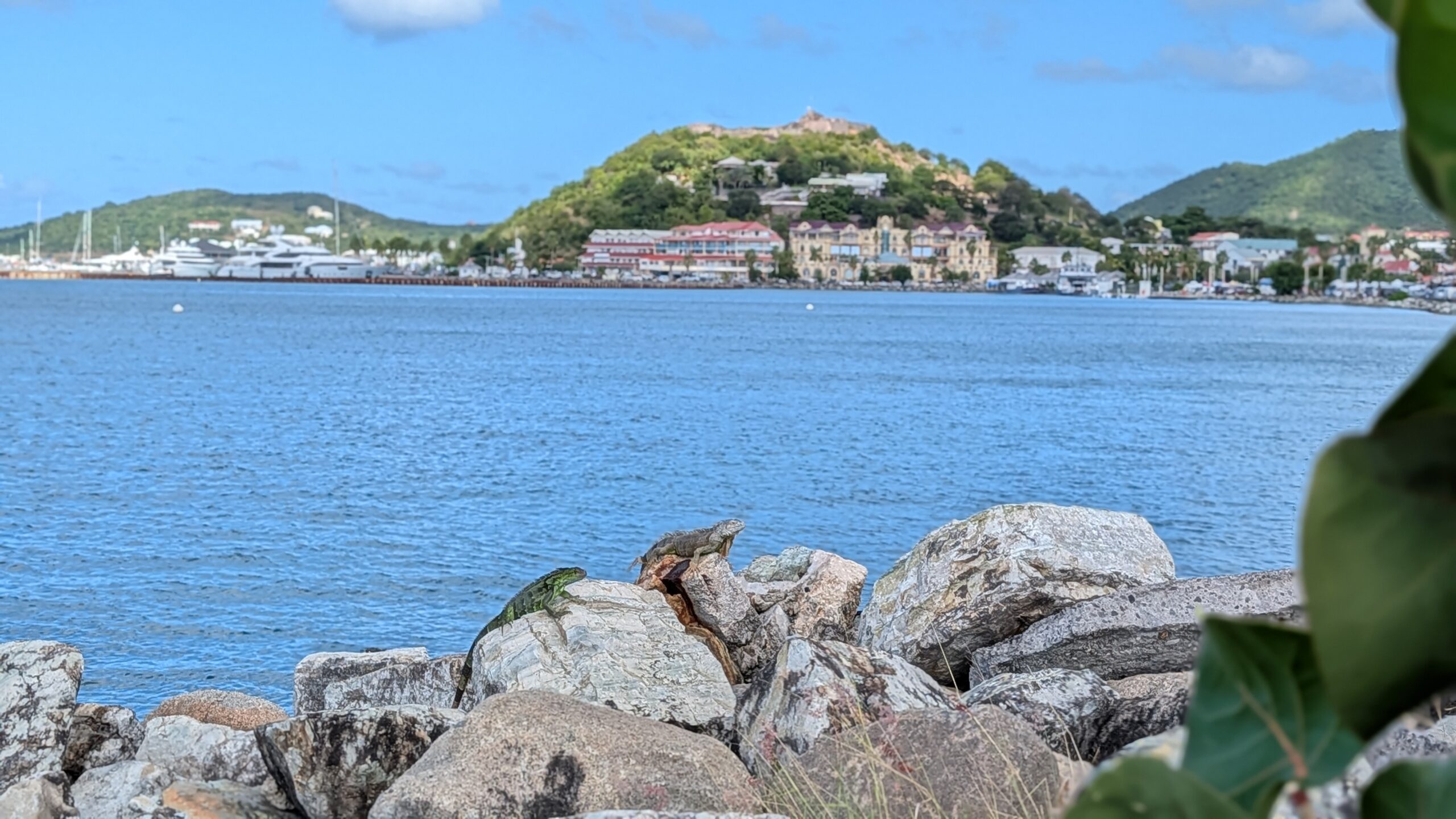 In Marigot der Hauptstadt des franz. Inselteiles, kommt endlich die Sonne raus und es wird ganz schön heiß als wir Leguane an der Küste beobachten. Daher beschließen wir uns einen Drink zu gönnen, doch das dauert denn auf der Suche nach einem Lokal stecken wir wieder im Stau. Außerdem sind Parkplätze auf der ganzen Insel kaum zu finden. Mit Geduld finden Parkplatz und eine nicht überlaufene Bar in Strandnähe. Wir wollen trotz nachmittäglicher Hitze (29 Grad) doch zur verfallenen Festung “Luis” fahren die sich nur 65 m über Meeresspiegel befindet. Einige Stufen müssen wir vom Parkplatz hinauf um den tollen Rundumblick auf die Nordküste zu genießen. Wegen dem kräftigen Wind fliegt Kurt die Drohne hier leider nicht.