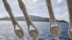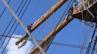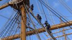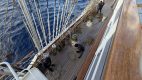 Um 8 Uhr acht Uhr klettert die Mannschaft in die Wanten um die Segel zu setzen. Das ist natürlich ein ganz spektakuläres Schauspiel, weil die Leute bis auf 50 m auf die Masten hochklettern müssen. Aber man merkt es ist eine eingespielte Mannschaft und jeder weiß wo er hingreifen muss.