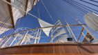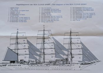 Wir genießen wieder das ausgezeichnete Frühstücksbuffet und um 09:00h müssen wir rauf aufs Sonnendeck, denn jetzt werden bei strahlendem Sonnenschein die Segel gesetzt. Das besondere dabei ist, dass unser erster Offizier Sandro Ferara jeden Schritt des Segelsetzens erklärt während die Mannschaft in luftiger Höhe die Segel setzt. Auf dem nachfolgenden Bild sieht man dass dies durchaus eine sehr komplexe Angelegenheit ist: