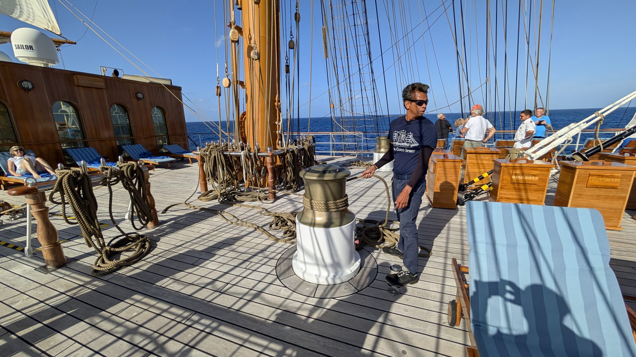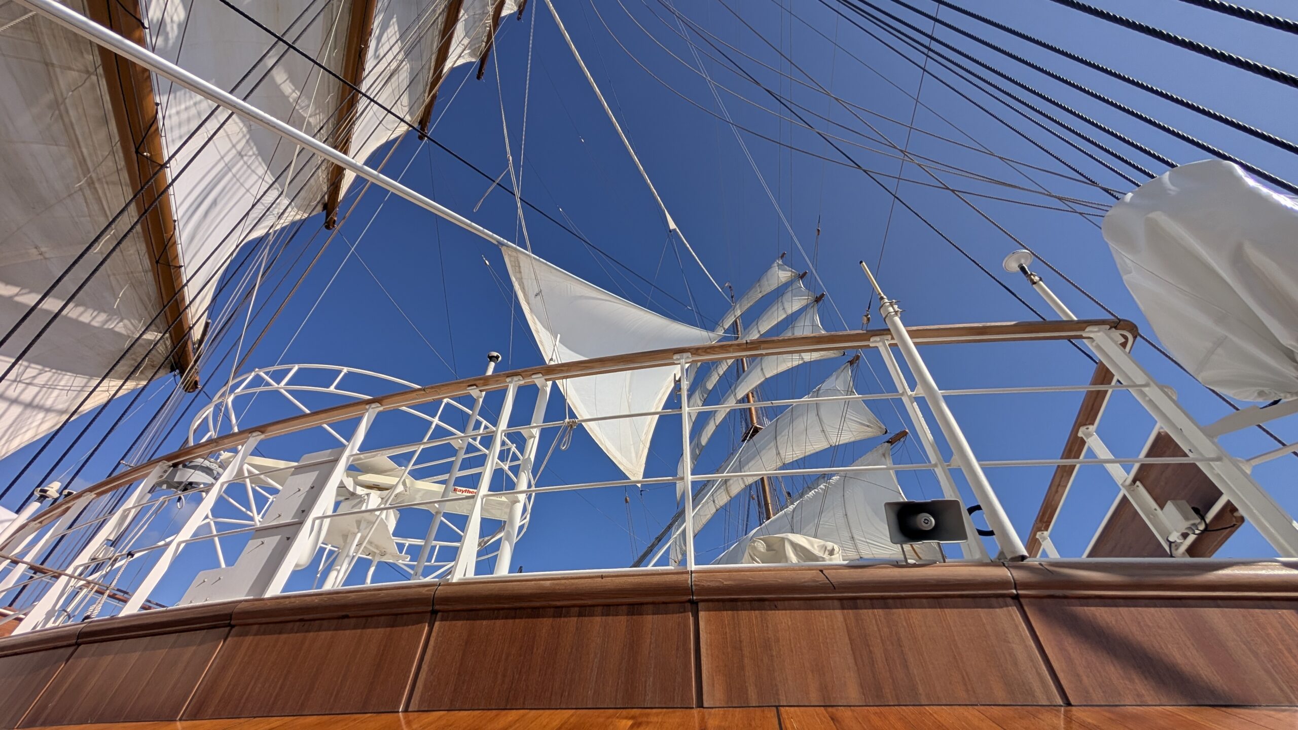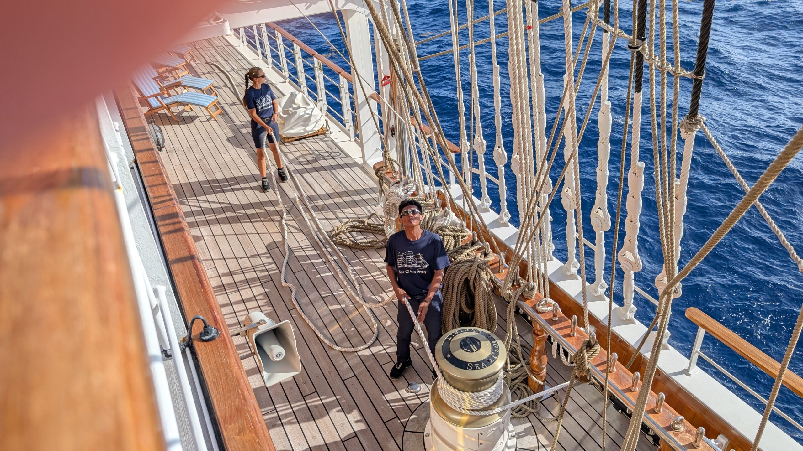 Aus Sicherheitsgründen haben die beiden Schiffe einen Mindestabstand von 1 Seemeile. Da die Segelfläche unserer Sea Cloud Spirit mit 4000m2 doppelt so groß ist wie jene der Sea Cloud II sind wir mit 6,5 Knoten etwas schneller unterwegs. Ausnahmsweise war es heute auch möglich den Bereich vor dem Fockmast zu betreten der normalerweise aus Sicherheitsgründen nur für die Crew zugänglich ist.