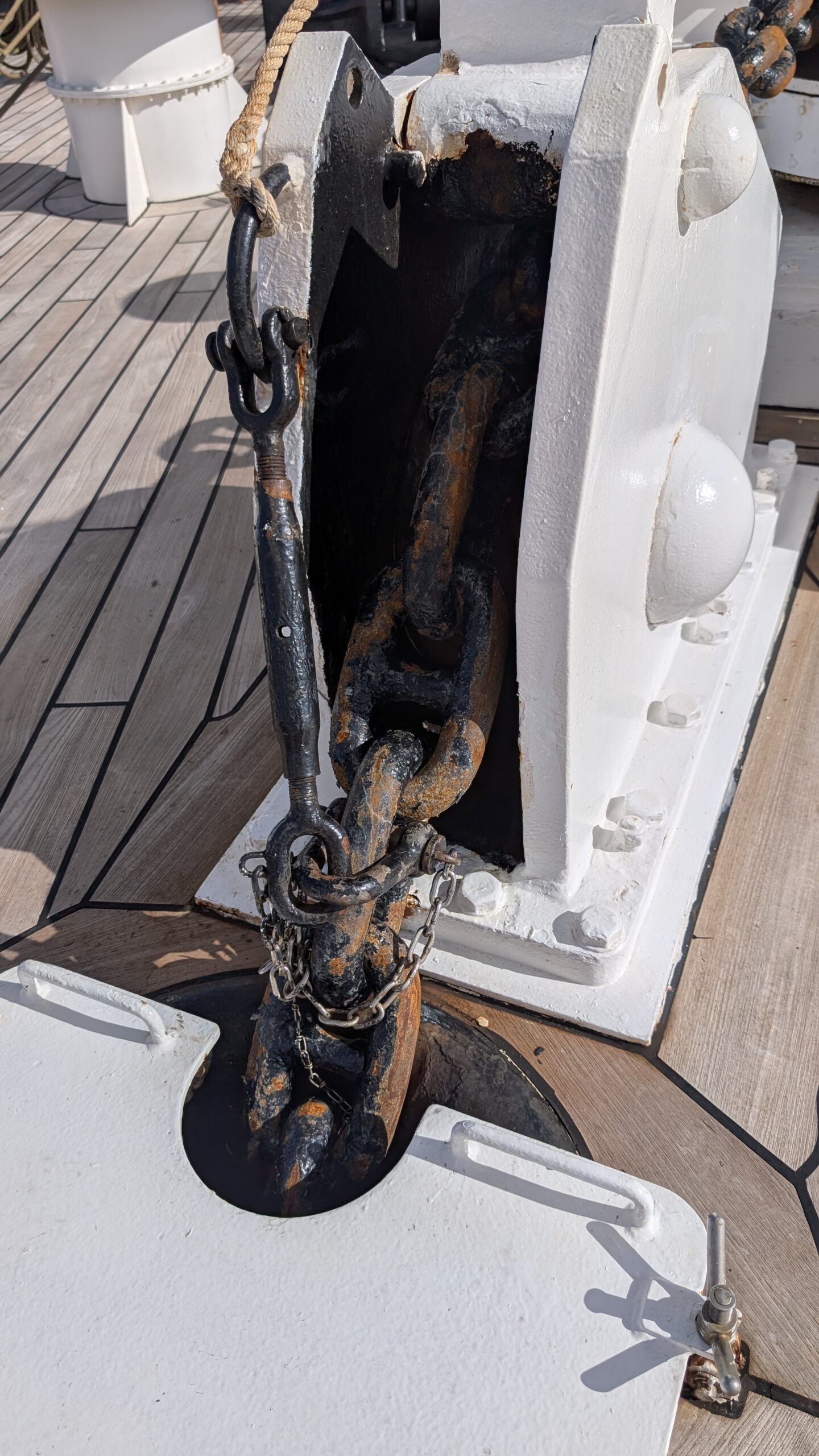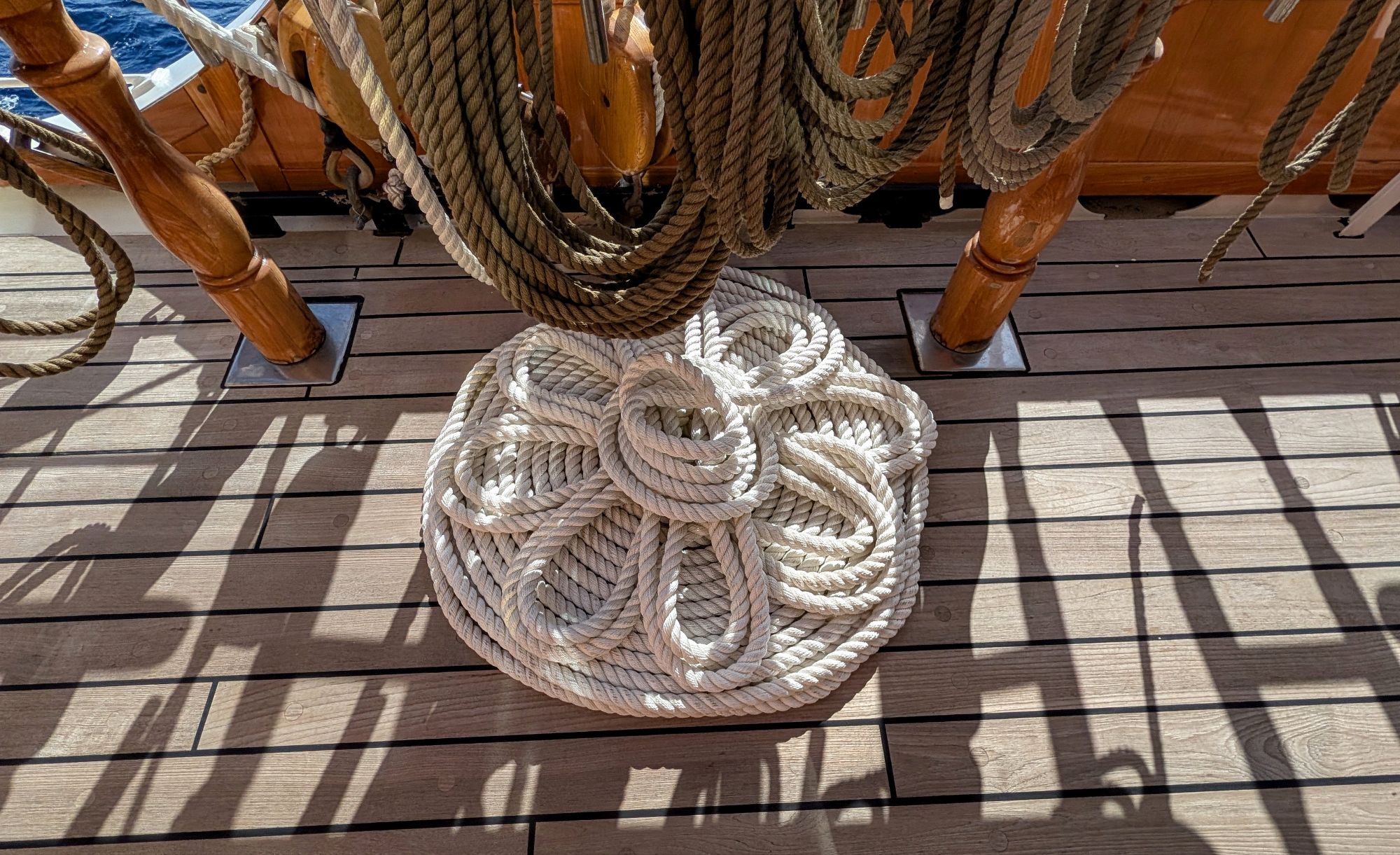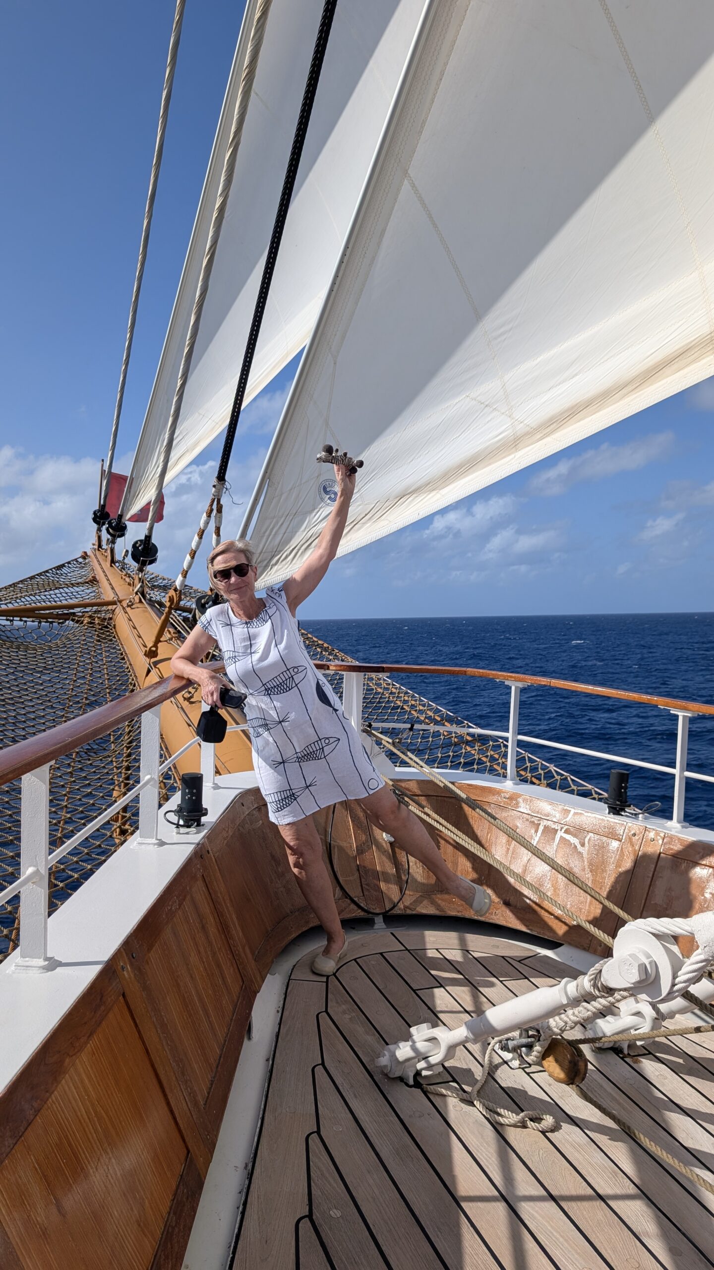 Aus Sicherheitsgründen haben die beiden Schiffe einen Mindestabstand von 1 Seemeile. Da die Segelfläche unserer Sea Cloud Spirit mit 4000m2 doppelt so groß ist wie jene der Sea Cloud II sind wir mit 6,5 Knoten etwas schneller unterwegs. Ausnahmsweise war es heute auch möglich den Bereich vor dem Fockmast zu betreten der normalerweise aus Sicherheitsgründen nur für die Crew zugänglich ist.