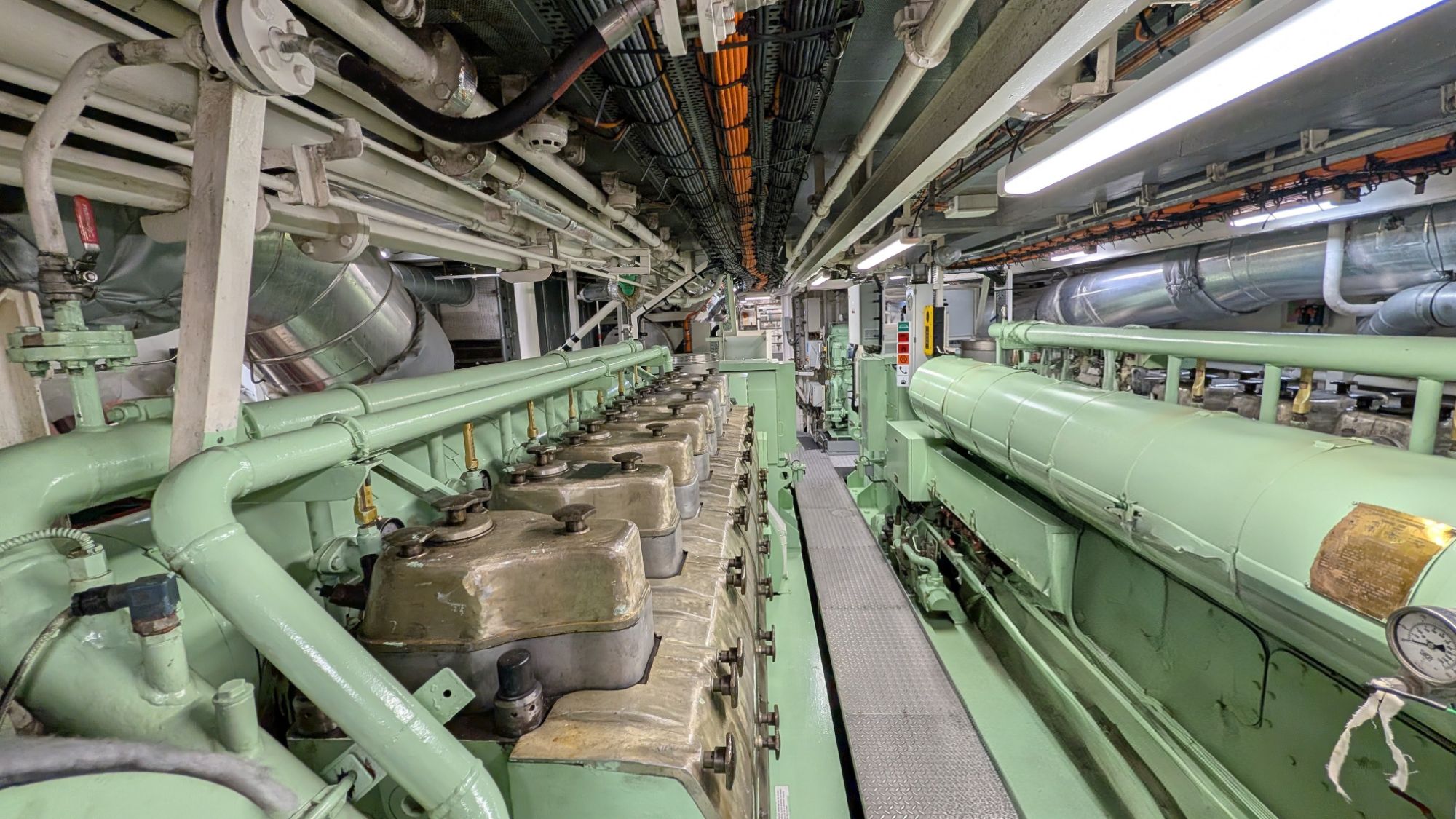 Nach dem Mittags Buffet nehmen wir an der Brücken- und Maschinenraum Besichtigung teil. Der zweite Offizier hat uns in sympathischer Weise die Navigation, Kommunikation mit der Mannschaft und das Brandlöschsystem erklärt. Im Maschinenraum ist uns richtig bewusst geworden dass es hier nicht nur um den Antrieb des Schiffes geht (in unserem Fall durch redundante Diesel Aggregate die Strom erzeugen – die Schiffschrauben werden von Siemens Elektromotoren angetrieben) sondern auch um Trinkwasser Erzeugung, Stromversorgung, Abwasser Reinigung, Klimatisierung, etc.