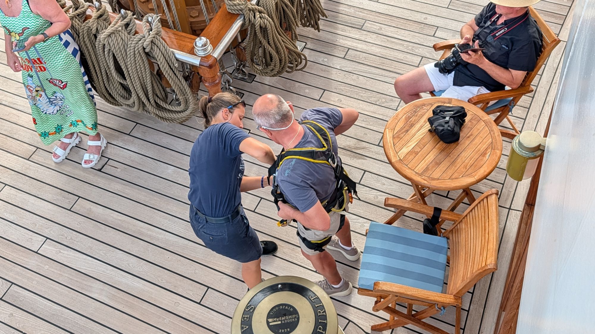 Dazu mussten wir einer nach dem anderen ein Kletterzeug anlegen. Dieses war mit zwei Karabinern und einer auf einem Sicherungsseil mitlaufenden Manschette ausgestattet. Wir wurden von einem Mann der Deck Crew Schritt für Schritt begleitet und auf der Plattform von einem Weiteren empfangen.