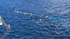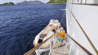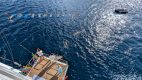 Mittagessen am Lido Deck, dann kommt plötzlich die Lautsprecher Ansage: Um 14:30h wird eine Badeplattform hinabgelassen damit wir alle direkt vom Schiff ins Wasser gehen können. Im Wasser schwimmende Liegen wurden ebenfalls bereitgestellt und einige Leute der Deck Crew sicherten den Badebereich mit Zodiaks ab.