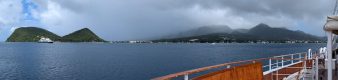 Unsere Sea Cloud Spirit lag um 08:00h früh vor Anker bei der Bucht von Cabrits. Als wir bei unserer Luke hinaussahen bemerkten wir gleich dass sich das Wetter hier anders verhält. Dominica ist nämlich eine sehr bergige Insel, die noch aktive Vulkane hat und deren höchste Erhebung ca. 1.450m ist. Da stauen sich die Wolken und das ergibt regemäßig Regen. Soviel, dass diese ca. 40 x 20km große Insel einen Regenwald hat und an die 350 Flüsse.